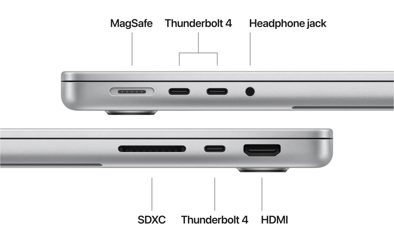 | Wired Connections: | HDMI, 3.5mm Headphone Jack, MagSafe 3, 3 x Thunderbolt 4 (USB-C) with charging, DisplayPort and USB4/Thunderbolt 4 up to 40Gbps |