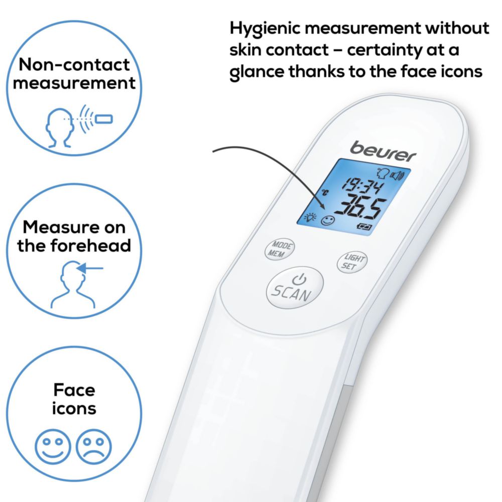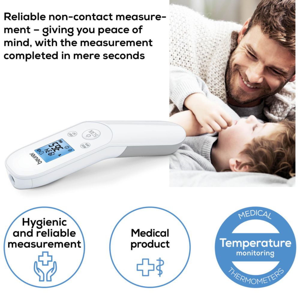 Introducing the Beurer Infrared Non Contact Digital Thermometer, the ultimate solution for accurate and convenient temperature measurement. This innovative device allows you to take your temperature without even touching your skin, making it perfect for families with young children, the elderly, or anyone looking for a hassle-free way to monitor their health. With its advanced infrared technology, this thermometer provides instant and precise readings in just one second, eliminating the need for uncomfortable ear or mouth thermometers. The non-contact design also reduces the risk of cross-contamination, making it a hygienic choice for households with multiple users. The Beurer Infrared Non Contact Digital Thermometer boasts a range of features that make it a must-have for any home. Its high-precision sensor ensures accurate readings, while the large backlit LCD display makes it easy to read results even in low-light conditions. The device also features a memory function that stores up to 10 previous readings, allowing you to track changes in your temperature over time. What sets this thermometer apart is its ease of use. Simply hold the device 3-5cm away from your forehead and press the button – it's that simple. The thermometer is also gentle enough for newborns, making it an essential tool for new parents. Upgrade your healthcare routine with the Beurer Infrared Non Contact Digital Thermometer. Its innovative design, accuracy, and convenience make it an ideal choice for anyone looking for a reliable and user-friendly thermometer. Say goodbye to uncomfortable and invasive temperature measurements – choose the Beurer Infrared Non Contact Digital Thermometer for a healthier and more convenient you.