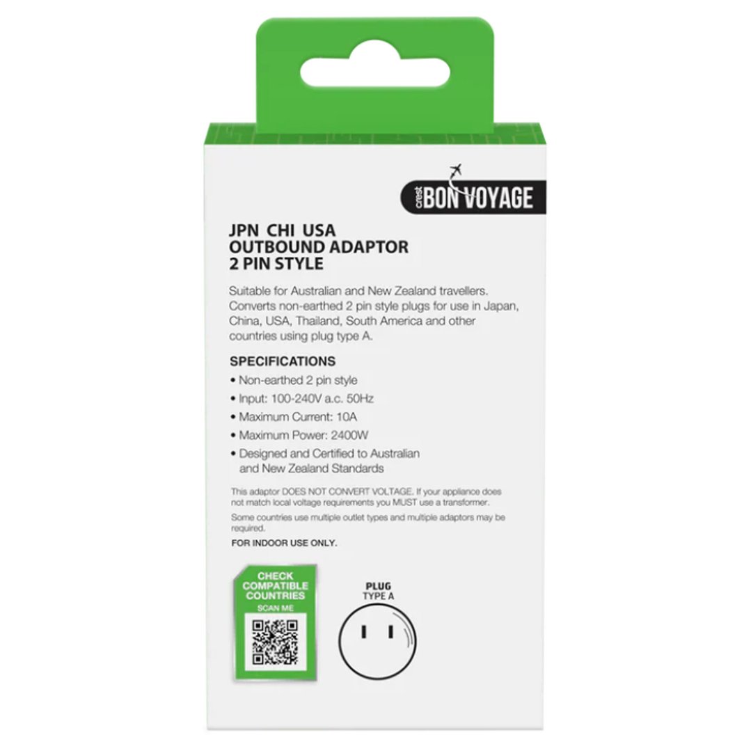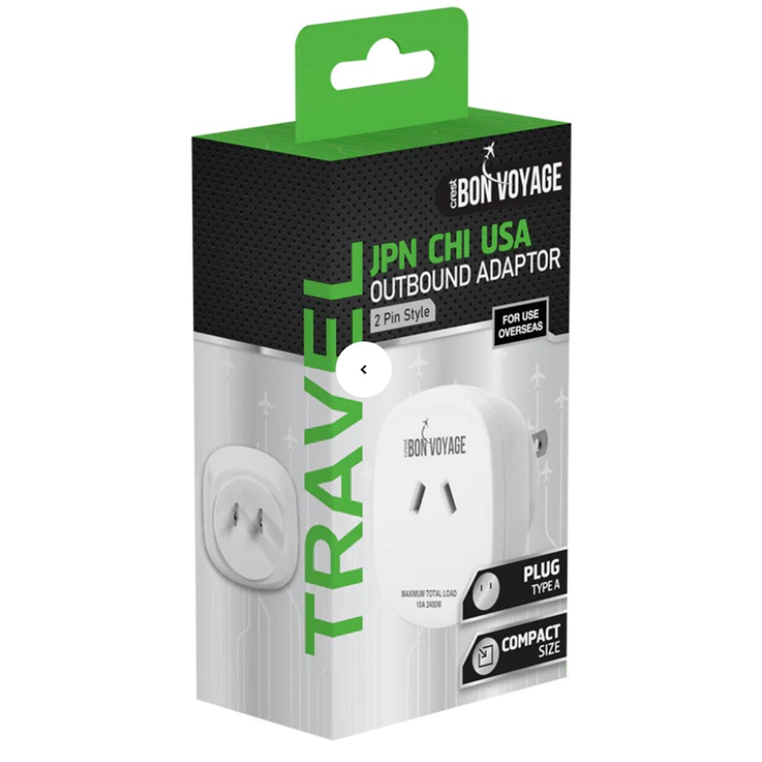 **Bon Voyage Travel Adaptor Australia to Japan: Power Up Your Japanese Adventure** Are you ready to embark on an unforgettable journey to Japan? Don't let worries about incompatible power outlets hold you back! Introducing the Bon Voyage Travel Adaptor Australia to Japan, your reliable companion for a hassle-free trip. Designed specifically for Australian travelers, this adaptor ensures you stay connected and powered up throughout your Japanese escapade. **Seamless Connectivity**: This travel adaptor is designed to accommodate Australian plugs (Type I) and convert them to Japanese plugs (Type A), allowing you to charge your devices, laptops, and cameras with ease. With a universal input voltage of 100-250V, you can power up your gadgets without worrying about voltage differences. **Safety First**: Built with safety in mind, our travel adaptor features a fuse-protected design to prevent overheating and short-circuiting. The durable construction and high-quality materials ensure a long lifespan, even with frequent use. **Convenience Unplugged**: Weighing in at just 60g, this lightweight adaptor is the perfect travel companion. Its compact design makes it easy to slip into your luggage or backpack, taking up minimal space. Plus, with a built-in USB port, you can charge your phone or tablet on the go. **Why Choose Bon Voyage?**: Our travel adaptor is designed specifically for Australian travelers heading to Japan, ensuring a seamless and stress-free experience. With its reliable performance, safety features, and compact design, you can focus on soaking up the vibrant culture, stunning landscapes, and mouth-watering cuisine Japan has to offer. **Pack the Bon Voyage Travel Adaptor Australia to Japan** and power up your Japanese adventure with confidence. Order now and get ready to explore the Land of the Rising Sun without any power worries holding you back!