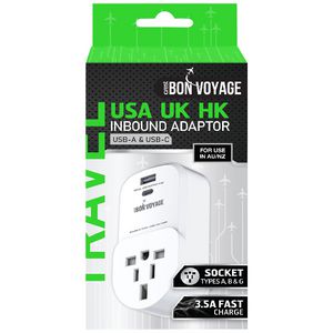 **Bon Voyage: Seamless Travel Between Australia and the USA with Our 2-Pack Travel Adaptor** Are you tired of the hassle and stress of traveling between Australia and the USA, only to find that your devices are incompatible with foreign outlets? Look no further! Our Bon Voyage Travel Adaptor Australia to USA (2 Pack) is the perfect solution for the modern traveler. Designed with convenience and safety in mind, our adaptors ensure that you stay connected and powered up wherever your journey takes you. This 2-pack travel adaptor set features two compact and lightweight units, each capable of accommodating three-pronged USA plugs (Type A and B) and two-pronged USA plugs (Type A), making it compatible with a wide range of devices, from laptops and smartphones to hair dryers and shavers. The adaptors are also designed with built-in surge protection, safeguarding your devices from power spikes and electrical shocks. With our Bon Voyage Travel Adaptor, you can: * Charge your devices quickly and efficiently, without the need for multiple adapters or converters * Enjoy peace of mind knowing that your devices are protected from electrical shocks and power surges * Travel confidently, with a compact and lightweight design that fits easily into your luggage * Stay connected with family, friends, and colleagues, no matter where you are in the world Whether you're a frequent flyer, a digital nomad, or simply a traveler looking for a hassle-free experience, our Bon Voyage Travel Adaptor Australia to USA (2 Pack) is the perfect accessory for your next adventure. Say goodbye to travel woes and hello to seamless connectivity with our reliable and efficient travel adapter.