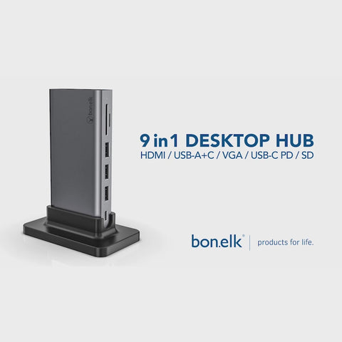 **Expand Your Productivity with the Bonelk Desktop 9in1 USB-C Multiport Hub** Upgrade your workspace with the Bonelk Desktop 9in1 USB-C Multiport Hub, designed to maximize your productivity and minimize clutter. This sleek and compact hub is the ultimate solution for those seeking to simplify their desktop setup while expanding their connectivity options. With 9 versatile ports, this multiport hub offers unparalleled flexibility and convenience. The USB-C hub features: * 2 x USB-A 3.0 ports for speedy data transfer and charging * 1 x USB-C Power Delivery port for up to 100W power delivery * 1 x HDMI port for seamless video output to 4K displays * 1 x VGA port for legacy display connections * 1 x Ethernet port for reliable internet connectivity * 1 x SD card slot and 1 x microSD card slot for easy file transfer * 1 x 3.5mm audio jack for crystal-clear sound This desktop hub is designed to streamline your workflow, allowing you to connect multiple devices at once and free up valuable desk space. The compact design ensures it won't take up much room, making it perfect for hot desking, coffee shops, or small offices. Enjoy the benefits of: * Faster data transfer speeds with USB 3.0 * Reliable internet connectivity with Ethernet * Crisp video output to 4K displays via HDMI * Convenient power delivery up to 100W * Easy file transfer with SD and microSD card slots Upgrade your workspace with the Bonelk Desktop 9in1 USB-C Multiport Hub and experience the ultimate in productivity and convenience. Order yours today and discover a more efficient you!