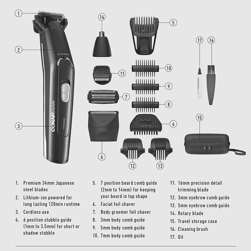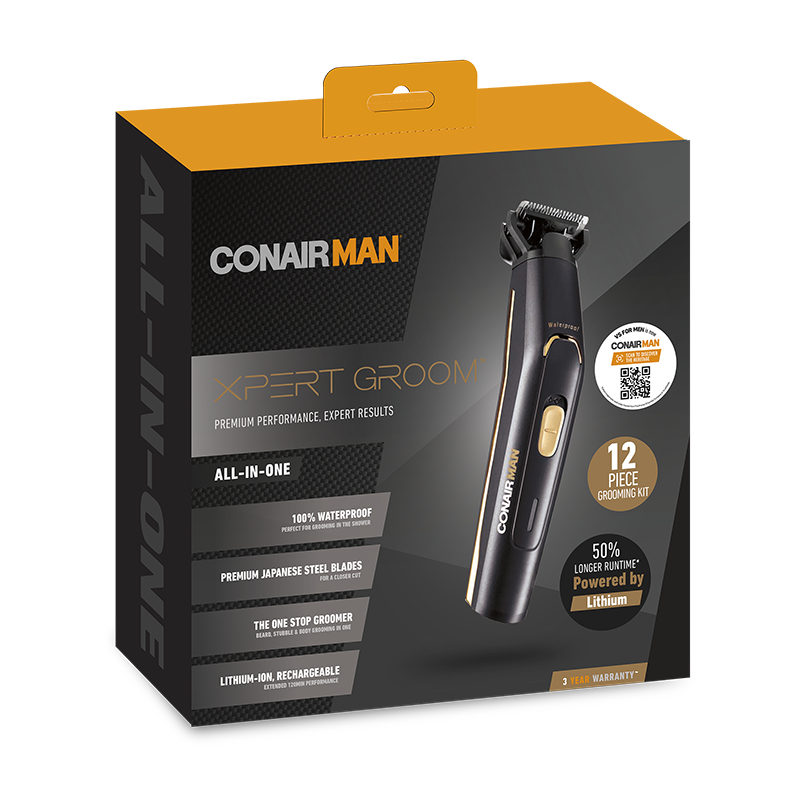 **Introducing ConairMan The Xpert Groom Trimmer - The Ultimate Grooming Companion for the Modern Australian Man** Take your grooming game to the next level with ConairMan The Xpert Groom Trimmer, designed specifically for the discerning Australian man. This premium trimmer is engineered to provide a precise, comfortable, and convenient grooming experience, perfect for busy lives on-the-go. **Unparalleled Performance** The Xpert Groom Trimmer boasts a powerful motor and advanced blade technology, ensuring a smooth and efficient cut every time. With 20 adjustable length settings, you can achieve the perfect trim for your beard, sideburns, or hairline. The ergonomic design and comfortable grip make it easy to maneuver, reducing fatigue and allowing for precise control. **Advanced Features** * Built-in LED light for enhanced visibility in hard-to-reach areas * Water-resistant design for easy cleaning and maintenance * Rechargeable lithium-ion battery providing up to 60 minutes of cordless use * Travel-friendly design with compact storage case **Benefits for the Modern Man** * Save time and effort with quick and easy trimming * Achieve a professional-looking trim at home, without the salon prices * Perfect for maintaining a neat and tidy beard or hairstyle on-the-go * Ideal for travel, with its compact design and rechargeable battery **Why Choose ConairMan The Xpert Groom Trimmer?** ConairMan is a trusted Australian brand, dedicated to delivering high-quality grooming products that cater to the unique needs of Australian men. With The Xpert Groom Trimmer, you can expect exceptional performance, durability, and style. Upgrade your grooming routine today and experience the difference for yourself. Order now and take the first step towards a more confident, well-groomed you!