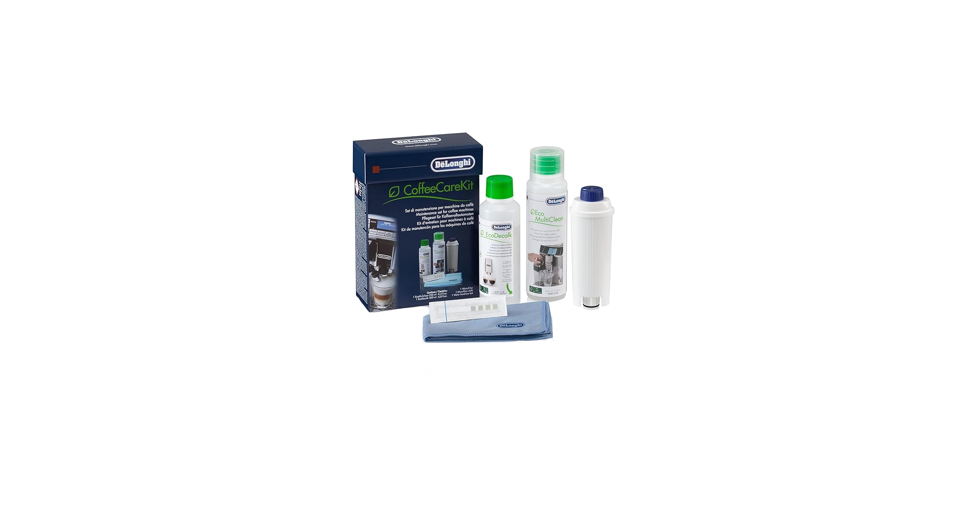 **Introducing the DeLonghi Coffee Care Kit: The Ultimate Coffee Lover's Companion** Indulge in the perfect cup of coffee every time with the DeLonghi Coffee Care Kit, specifically designed to maintain and optimize the performance of your DeLonghi coffee machine. This comprehensive kit is a must-have for coffee enthusiasts who demand the best from their morning brew. The kit includes a set of carefully crafted tools and cleaning solutions to ensure your machine operates at its peak. The water filter cleaner effectively removes impurities and scale buildup, preventing any unwanted flavors and odors from affecting your coffee's taste. The coffee machine cleaner and descaler work in harmony to eliminate old coffee oils, residue, and mineral deposits, guaranteeing a fresher and more vibrant coffee experience. The DeLonghi Coffee Care Kit offers numerous benefits that set it apart from other cleaning solutions on the market. Its unique formula is specifically designed for DeLonghi machines, ensuring compatibility and effectiveness. The kit is easy to use, with clear instructions and a simple application process that saves you time and hassle. By regularly cleaning and maintaining your machine, you'll extend its lifespan, reduce energy consumption, and enjoy a consistently great-tasting cup of coffee. Invest in the DeLonghi Coffee Care Kit today and experience the difference it makes in your daily coffee ritual. With its premium quality and DeLonghi-approved formula, this kit is the perfect addition to any coffee lover's arsenal. Treat yourself to a superior coffee experience, every time.