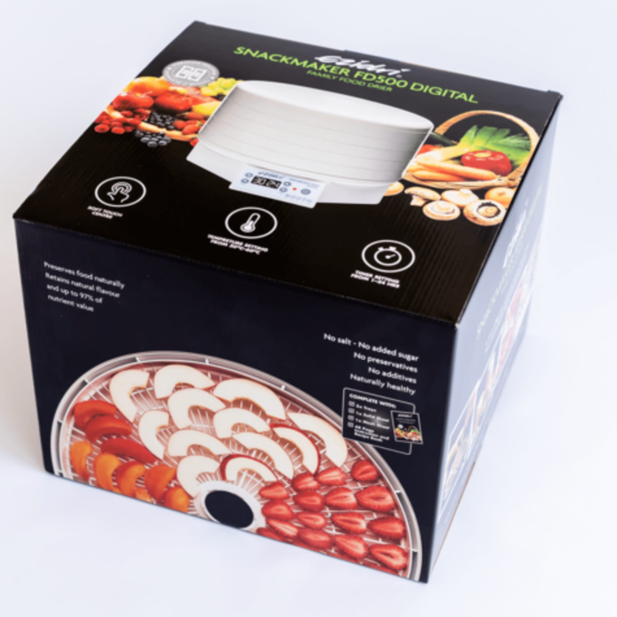 Introducing the EZIDRI Snackmaker FD500 Digital Food Dehydrator, the ultimate game-changer for health-conscious foodies and snack enthusiasts in Australia! This innovative kitchen appliance allows you to create a wide variety of delicious, nutritious, and crispy snacks from the comfort of your own home. With its advanced digital technology and 5-tray capacity, the EZIDRI Snackmaker FD500 makes it easy to dry fruits, vegetables, meats, and even pet treats to perfection. The intuitive digital control panel features 10 preset temperature settings (30°C - 70°C) and a 24-hour timer, giving you complete control over the dehydration process. Enjoy the benefits of healthy snacking with the EZIDRI Snackmaker FD500: * Preserve nutrients and flavors without adding preservatives or additives * Make your own crispy fruit leathers, beef jerky, and veggie chips * Create healthy pet treats that are free from chemicals and preservatives * Experiment with new recipes and flavors, from sweet potato chips to kale chips * Save money by buying ingredients in bulk and drying them at home The EZIDRI Snackmaker FD500 is designed with convenience and safety in mind. The BPA-free trays are easy to clean and dishwasher safe, while the rear-mounted fan ensures efficient air circulation and reduced noise levels. Upgrade your snack game and join the healthy eating revolution with the EZIDRI Snackmaker FD500 Digital Food Dehydrator. Order yours today and start creating delicious, nutritious snacks that the whole family will love!