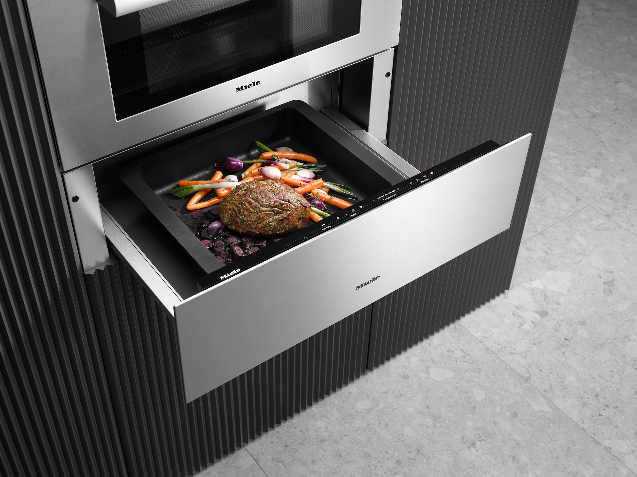 **Experience the Art of Warming with Miele's ESW 7010 Obsidian Black Warming Drawers** Elevate your entertaining and dining experience with the Miele ESW 7010 Obsidian Black Warming Drawers, designed to keep your cooked meals warm and ready to serve at the perfect temperature. This sleek and sophisticated appliance is a must-have for any serious home chef or entertainer. Featuring three spacious drawers with a combined capacity of 90 liters, the ESW 7010 provides ample room to warm multiple dishes simultaneously, ensuring that all your guests are served hot, fresh meals. The advanced warming system utilizes gentle, even heat distribution to prevent overheating and drying out of food, preserving the flavors and textures of your culinary creations. The Obsidian Black finish adds a touch of sophistication to any kitchen, while the intuitive touch controls make it easy to select from three preset temperature settings (40°C, 60°C, and 80°C) to suit your specific warming needs. The soft-close drawers and interior lighting ensure smooth operation and easy visibility of your warmed dishes. With the Miele ESW 7010, you can focus on enjoying time with family and friends, knowing that your meals are being kept at the perfect temperature. Perfect for busy households, dinner parties, or special occasions, this warming drawer is a game-changer for anyone who values convenience, flexibility, and exceptional performance. Invest in the Miele ESW 7010 Obsidian Black Warming Drawers and discover a new level of entertaining elegance.