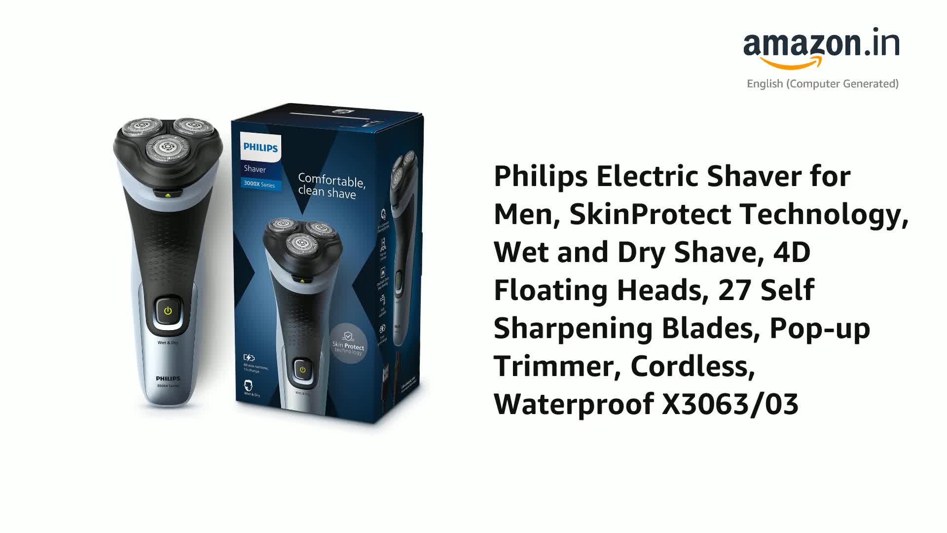 | Additional Features: | 27 self-sharpening blades, 55.000 cuts/minute, Anti-Corrosion Shaving System, 3D Floating Heads, 4D Flex Heads follow your face for a comfortable shave, One-touch open for easy cleaning, Anti-slip grip |