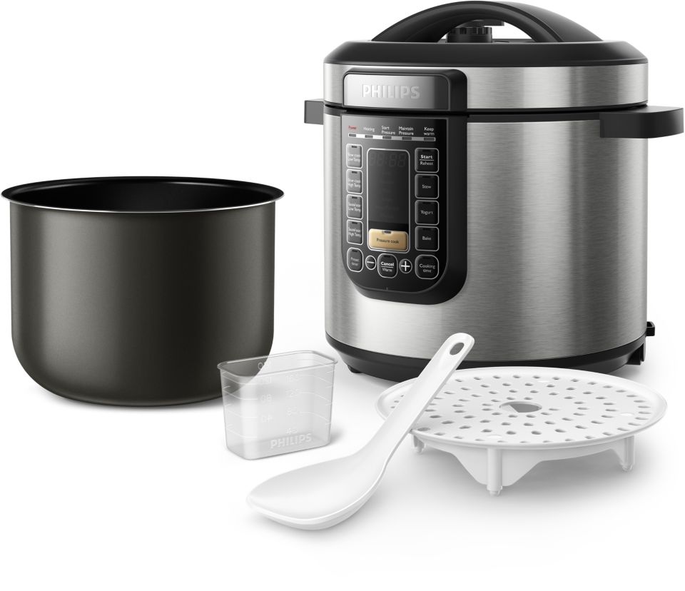 **Introducing the Philips All-In-One Cooker: The Ultimate Kitchen Companion** Experience the power of multi-cooking with the Philips All-In-One Cooker, designed to revolutionize the way you cook in the comfort of your own home. This innovative kitchen appliance is perfect for busy Australians who want to cook healthy, delicious meals quickly and easily. With its sleek and compact design, this cooker seamlessly combines the functions of a pressure cooker, slow cooker, rice cooker, sauté pan, and yogurt maker in one. The Philips All-In-One Cooker takes the hassle out of cooking, allowing you to prepare a wide range of dishes from hearty stews and soups to tender meats, fluffy rice, and even homemade yogurt. Enjoy the benefits of: * **Fast Cooking**: Pressure cook up to 70% faster than traditional cooking methods, perfect for busy weeknights. * **Easy Meal Prep**: Slow cook all day while you're out and about, coming home to a ready-to-eat meal. * **Versatility**: Cook a variety of dishes, from breakfast to dinner, with the 10 pre-set programs and adjustable temperature control. * **Healthy Cooking**: Retain nutrients and flavors with the cooker's advanced steam technology. * **Cleaning Made Easy**: The dishwasher-safe inner pot and accessories make cleaning a breeze. Upgrade your kitchen with the Philips All-In-One Cooker, perfect for singles, couples, and families alike. Whether you're a culinary novice or an experienced chef, this cooker's intuitive interface and user-friendly design ensure that anyone can cook like a pro. Say goodbye to kitchen clutter and hello to a world of possibilities with the Philips All-In-One Cooker.