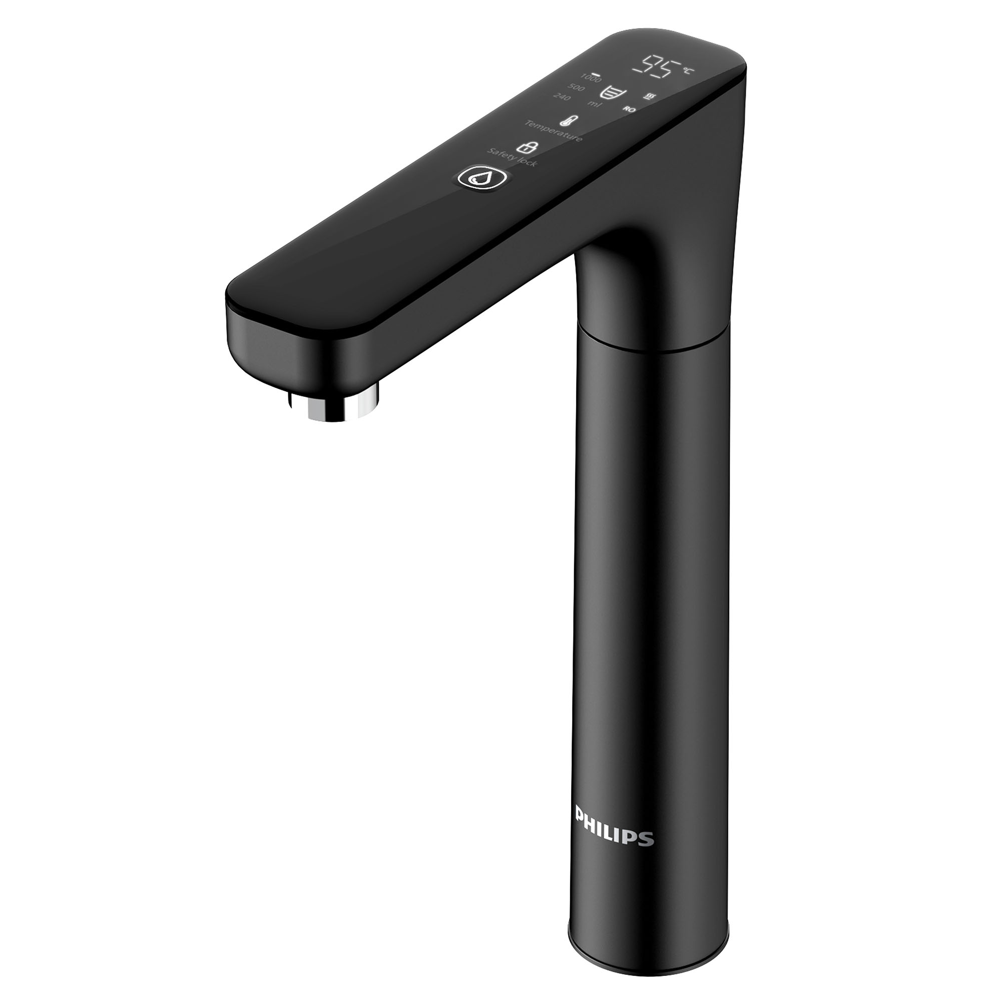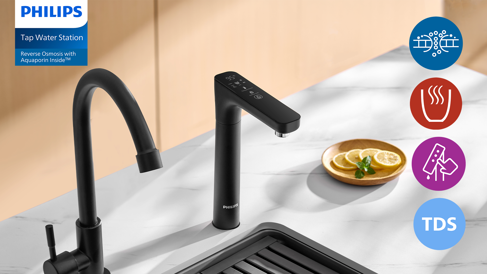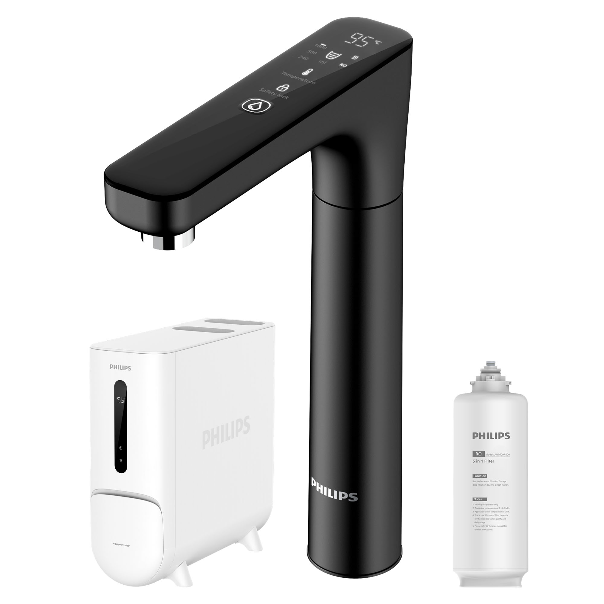 | Additional Features: | Smart Multi-Temp Faucet (120° swivel): Select your desired temperature (ambient,45°C, 55°C, 65°C, 75°C, 85°C or 95°C) and dispensing volume (240ml, 500ml, 1000ml or continues) for easy dispensing. Reverse Osmosis 5-layer filter with Aquaporin InsideTM: Biomimetic membrane with aquaporin proteins to filter water more energy-efficient down to 0.0001 micron pore size. Total Dissolved Solids monitoring Smart faucet displays TDS value post filtering inreal-time for quality reassurance. Small footprint (17cm wide |