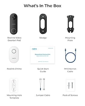 | What's In The Box: | 1x Reolink Video Doorbell PoE, 1x Reolink Chime, 1x Mounting Plate, 1x Wedge, 1x Jumper Cables, 1x Extension Cable, 1x 1m Network Cable, Quick Start Guide |