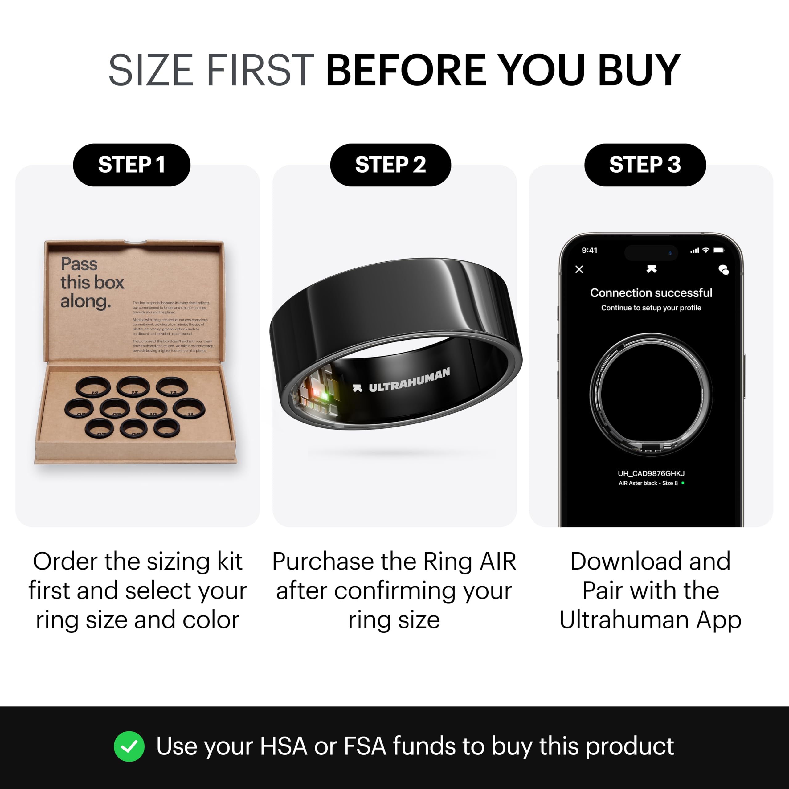 **Introducing the Ultrahuman Ring Air Size 09 Aster Black: Elevate Your Fitness Tracking Experience** Take your fitness journey to new heights with the Ultrahuman Ring Air Size 09 Aster Black, the ultimate wearable device designed to track your progress and optimize your performance. This sleek and stylish ring is not just a fashion statement, but a powerful tool that provides in-depth insights into your body's vital signs, activity levels, and sleep patterns. Crafted with precision and durability in mind, the Aster Black features a robust design that can withstand even the toughest workouts. The ring's advanced sensors track your heart rate, blood oxygen levels, and other vital signs in real-time, providing valuable information to help you optimize your training and recovery. But that's not all. The Ultrahuman Ring Air also includes advanced features such as built-in GPS, water resistance up to 50 meters, and automatic sleep tracking. Stay connected with notifications from your phone, and control your music playlists with ease. What sets the Ultrahuman Ring Air apart is its ability to provide personalized recommendations based on your unique body metrics. Receive actionable insights and guidance to improve your performance, reduce fatigue, and enhance your overall well-being. Whether you're a professional athlete or just starting your fitness journey, the Ultrahuman Ring Air Size 09 Aster Black is the perfect companion to help you reach your goals. Experience the future of wearable technology today and unlock your full potential with this innovative, high-performance fitness tracker.