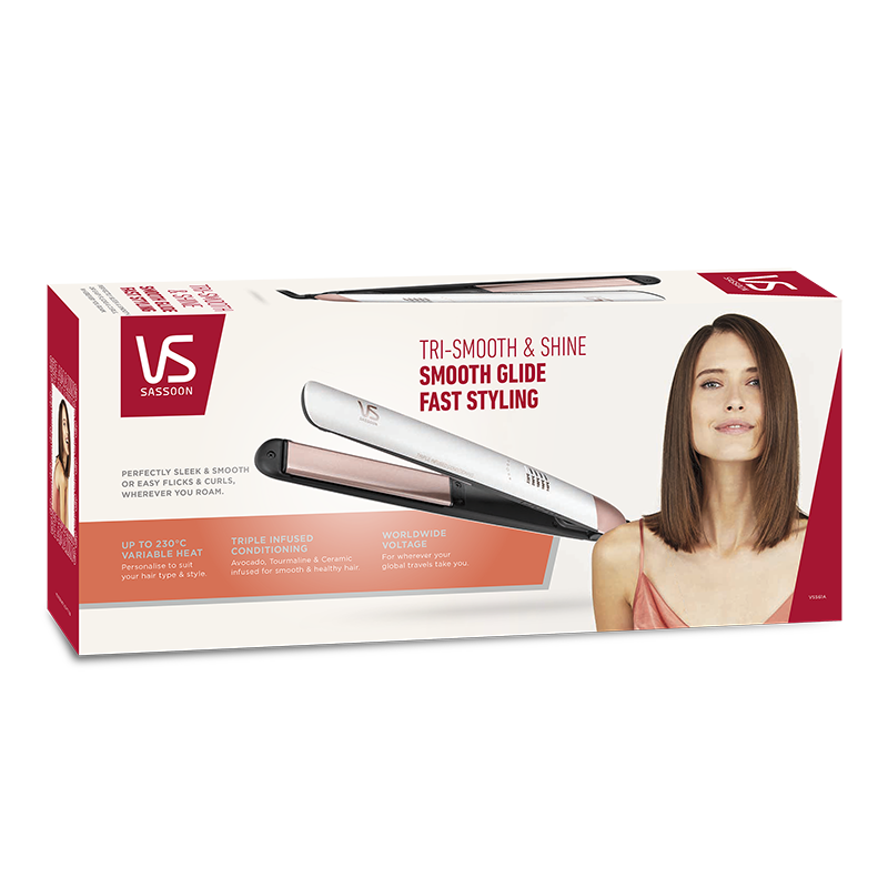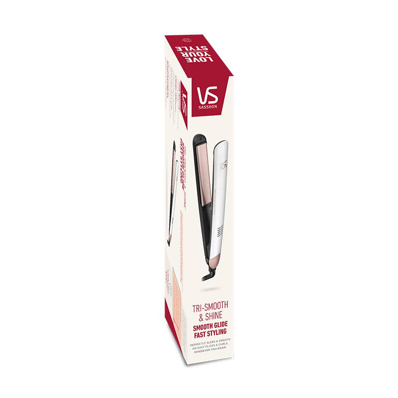 **Introducing the VS Sassoon Tri-Smooth And Shine Straightener: Salon-Quality Styling at Home** Say goodbye to bad hair days and hello to sleek, silky locks with the VS Sassoon Tri-Smooth And Shine Straightener. This innovative styling tool is designed to give you salon-quality results in the comfort of your own home. With its advanced tri-ceramic coating and ionic technology, this straightener effortlessly glides through your hair, smoothing frizz and flyaways while adding a radiant shine. The VS Sassoon Tri-Smooth And Shine Straightener boasts three key features that set it apart from other straighteners on the market. Firstly, its unique tri-ceramic coating ensures even heat distribution, preventing hotspots and damage to your hair. Secondly, the ionic technology emits negative ions that help to break up water molecules, resulting in faster drying and styling times. Finally, the adjustable heat control (up to 230°C) allows you to customize the temperature to suit your hair type, ensuring a perfect finish every time. The benefits of this straightener are endless. Say goodbye to split ends and breakage, and hello to silky, smooth hair that's full of life. The VS Sassoon Tri-Smooth And Shine Straightener is perfect for all hair types, including curly, wavy, and straight hair. Its ergonomic design and comfortable grip make it easy to use, even for those hard-to-reach areas. With this straightener, you'll achieve salon-quality results without the hefty price tag. Get ready to turn heads with your luscious, healthy-looking locks. Order your VS Sassoon Tri-Smooth And Shine Straightener today and experience the power of professional styling at home!